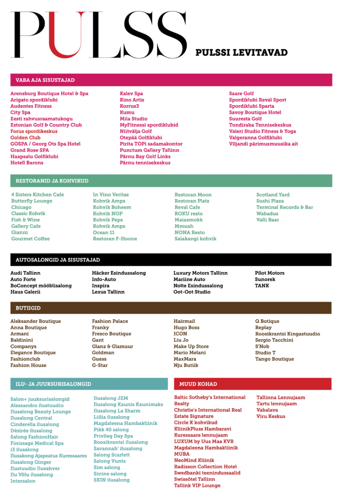 Kui peaksite leidma, et PULSS võiks anda lisaväärtust teiegi ettevõtte püsiklientidele/külastajatele – ehk olema potentsiaalselt huvitatud ajakirja LEVIPARTNERLUSEST – palun võtke ühendust!